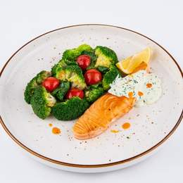 Семга филе, сливочный соус со шпинатом, брокколи, черри, шпинат, лимон