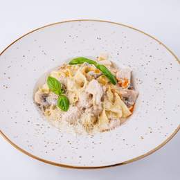Паста твердых сортов, куриное филе, шампиньоны, сливки, пармезан, базилик.