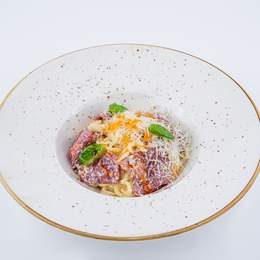 Паста твердых сортов, жая конины, сливки, желток, пармезан
