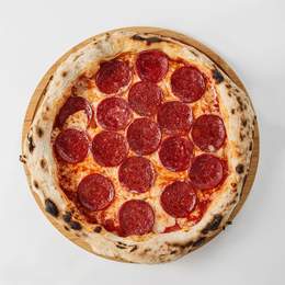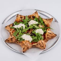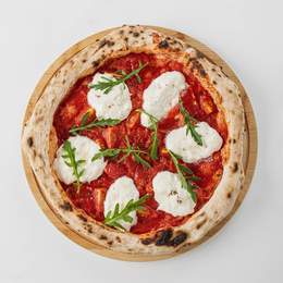 Неополитанское тесто, креметта, моцарелла, шампиньоны,карамелизованый лук, руккола, страчителла, томаты пелати
