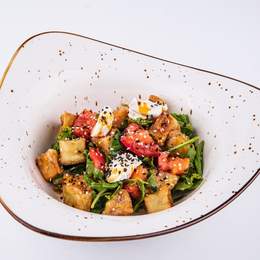 Лист салата, руккола, баклажан в панировке, помидор, свит чили, креметта, микс кунжута.