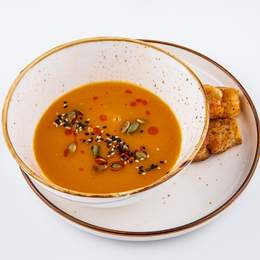 Запеченая тыква, морковь, лук, семена тыквы, кунжут, гренки.