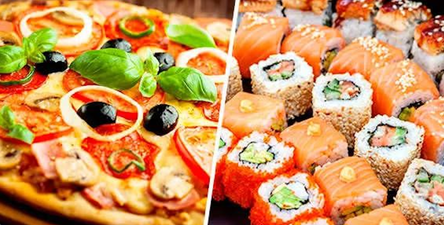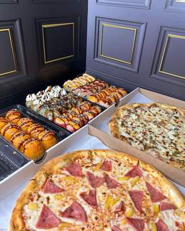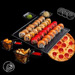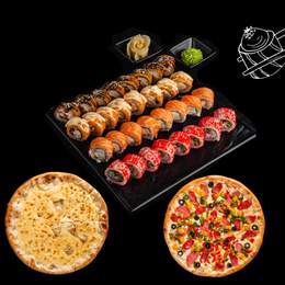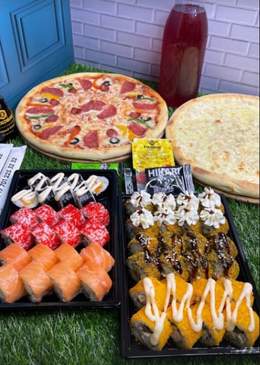 Роллы "Филадельфия", "Американский", "Калифорния", "Сяке темпура", "Цезарь темпура", "Маки с креветкой", пицца "4 сыра", пицца "Охотничья" + морс в подарок