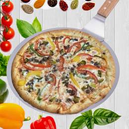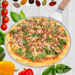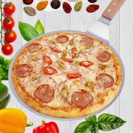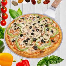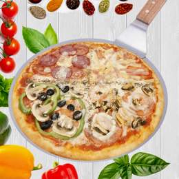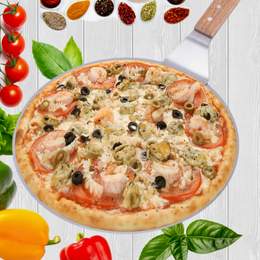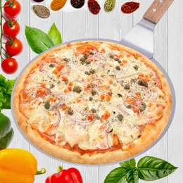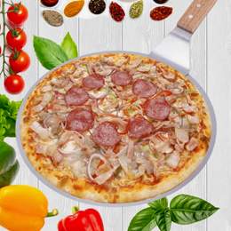 Фирменный "Пицца соус", сыр Моцарелла, болгарский перец, ананасы, маслины, колбаса, шампиньоны, ветчина говяжья, креветки, томаты