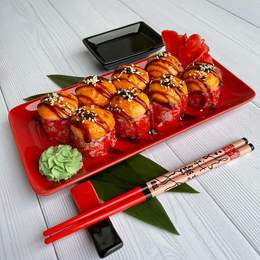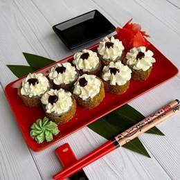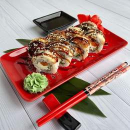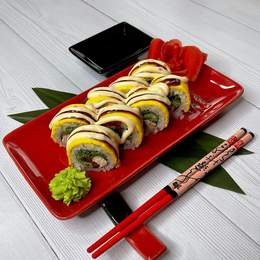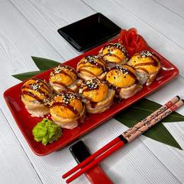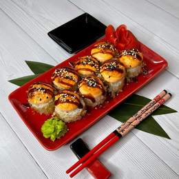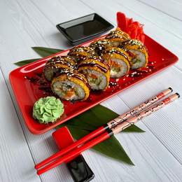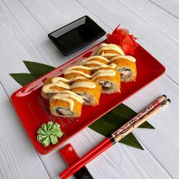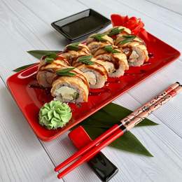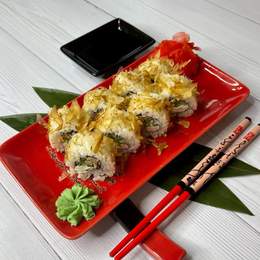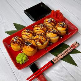 Рис, нори, сыр, огурец, лосось, томаго, унаги соус, кляр, панко