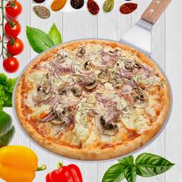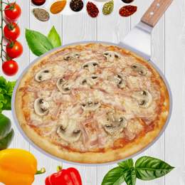Фирменный "Пицца соус", сыр Моцарелла, ветчина говяжья, шампиньоны