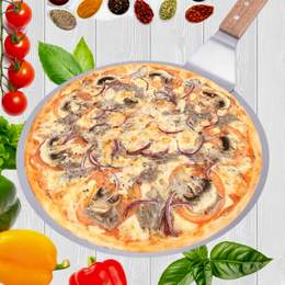 Фирменный "Пицца соус", сыр Моцарелла, говядина, курица, шампиньоны, красный лук, томаты