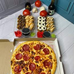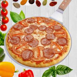 Фирменный "Пицца соус", сыр Моцарелла, салями, охотничьи сосиски, говядина, красный лук, томаты