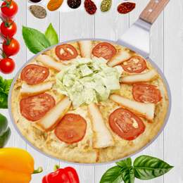Фирменный "Пицца соус", сыр Моцарелла, курица, шампиньоны, салат айсберг, томаты, соус "Цезарь"