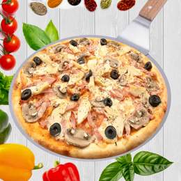 Фирменный "Пицца соус", сыр Моцарелла, ветчина говяжья, шампиньоны, маслины, томаты