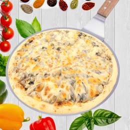 Фирменный "Пицца соус", сыр Моцарелла, лук репчатый, курица, шампиньоны