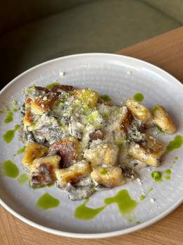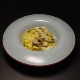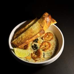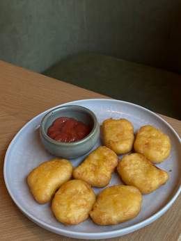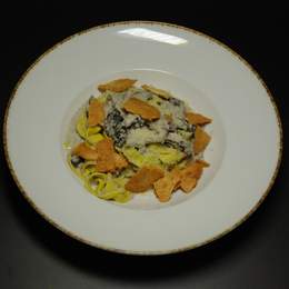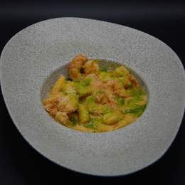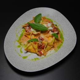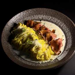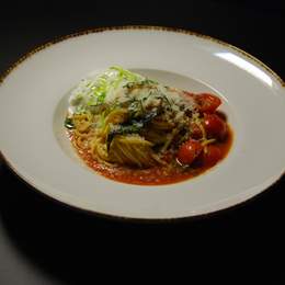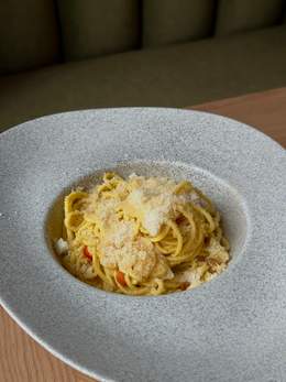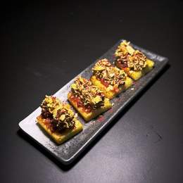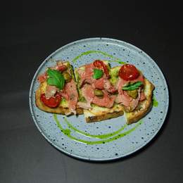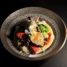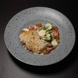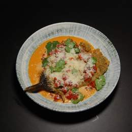 Хрустящий баклажан в панко-кляре, запечённый до золотистой корочки, под пикантным соусом путанеска и яркой сальсой. Сверху — тёртый пармезан и свежая кинза, добавляющие аромат и глубину вкуса. Сочное, хрустящее и страстное блюдо с южным темпераментом