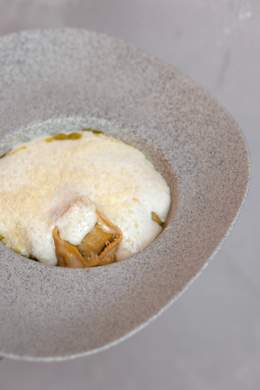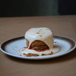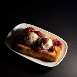 Пан пердю с черешней — карамелизированная бриошь, обжаренная до золотистой корочки, с вишнёво-черешневым соусом, лёгким ароматом эстрагона.