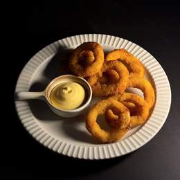 Луковые кольца — хрустящие, румяные, с нежным сладковатым луком внутри. Подаются с сырным соусом.