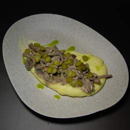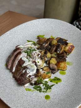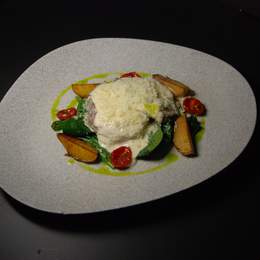 Говяжья вырезка, шпинат, молодой картофель, вяленые черри, сыр пармезан, соус Пепер