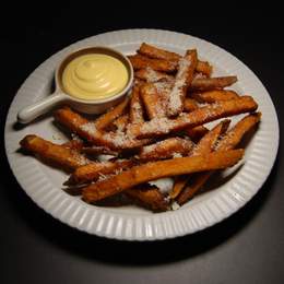 Фри из батата — это хрустящая корочка, нежная сладость внутри и золотистое совершенство с каждым укусом. Легкий карамельный вкус и яркий характер — идеальный гарнир с изюминкой с сырным соусом