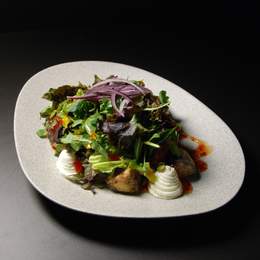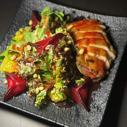 Салат с утиной грудкой — это сочный микс салата, терпкая вишня, освежающий фреш лайма и огненный соус шрирача. Яркое сочетание сладости, остроты и цитрусовой свежести, где каждая нотка подчёркивает изысканный вкус утки