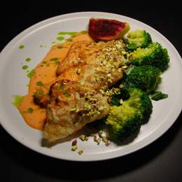 Судак с фисташками и икрой летучей рыбы — это изысканное сочетание нежного филе судака, обжаренного до идеальной золотистой корочки, с хрустящими фисташками и яркой икрой. Брокколи и шпинат добавляют свежести и зелёного акцента, создавая гармоничное