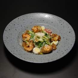 Креветки, соус Цезарь, черри, сыр пармезан, ромейн, сухари, перепелиные яйца
