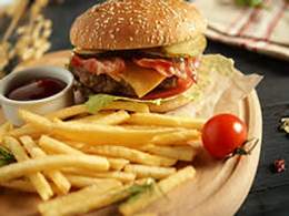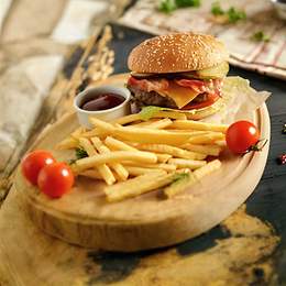 Булочка, котлета, лист салата, овощи, сыр и картофель фри