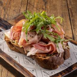Хлеб из пшеничной муки с слабосоленой форелью ,рукколой и страчателлой