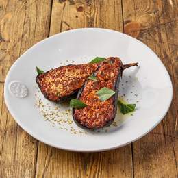 Запеченный в печи с сыром Пармезан и соусом болоньезе баклажан с добавлением чеснока, специй, оливкового масла и кинзы