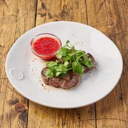 Нежный люля-кебаб из баранины на гриле с болгарским перцем, маринованным красным луком, миксом зелени и зернами граната. Подается с домашней аджикой
