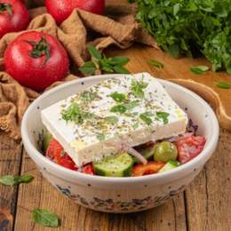 Салат из свежих огурцов, помидоров, болгарского перца, красного лука, оливок, орегано, домашней брынзы Чанах и оливкового масла