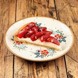 Легкий песочный корж из миндальной муки с нежным кремом из сливочного сыра Креметте, ванилью и свежими ягодами клубники