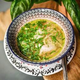 Бульон с нежным куриным филе, домашней лапшой, овощами и зеленью