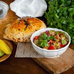 Лепешка из дровяной печи с икрой из запеченных баклажанов, свежих помидоров, красного лука и кинзы