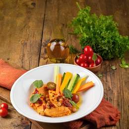 Хумус из печеного перца с добавлением отварного нута, вяленых томатов, рубленой петрушки и оливкового масла. Подается с хрустящими овощами