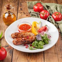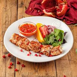 Нежный люля-кебаб из курицы на гриле с курдюком, болгарским перцем, маринованным красным луком, миксом зелени и зернами граната. Подается с домашней аджикой