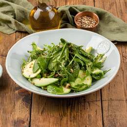 Салат из отборных овощей: спелого авокадо, шпината, сельдерея, руколы с добавлением мяты, под медово-лимонной заправкой с протеиновым миксом орехов и семян