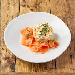 Салат оливье с нежным слабосоленой форелью и молодым зеленым горошком