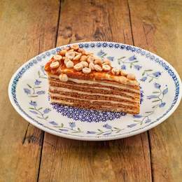 Мягкие медовые коржи с нежным сметанным кремом, бисквитной крошкой, насыщенной соленой карамелью и фундуком