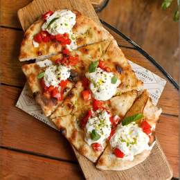 Фокачча из дровяной печи с узбекскими помидорами, красным луком, свежим базиликом, оливковым маслом и сливочной Бурратой