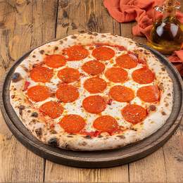 Пицца из печи со слайсами пикантной Пепперони, томатным соусом и домашней Моцареллой