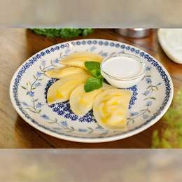 Вреники с творогом собственного изготовления,подается со сметанолй и апельсиновой цедрой
