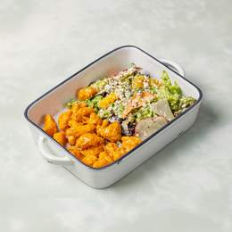 Микс салата, цитрусовый соус, цыпленок, соус карри, цветная капуста, соус кинуа, апельсин