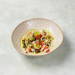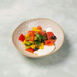 Огурец маринованный, помидор розовый, перец болгарский, оливки и каперсы, лук красный, фетакса, базилик, перец, соль, соус ферма