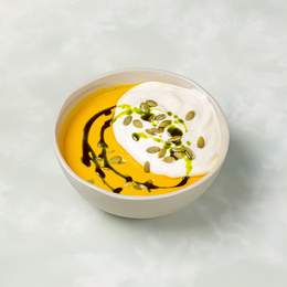 Тыква , морковь, сливки, тимьян, страчателла, творожный сыр, тыквенные семечки , зеленое масло