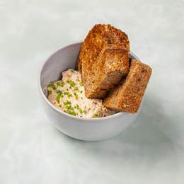 Лосось копченный, соль, масло оливковое, картофель пай, взбитая сметана, соусы — топенада, ремулад, гречневый хлеб
