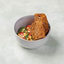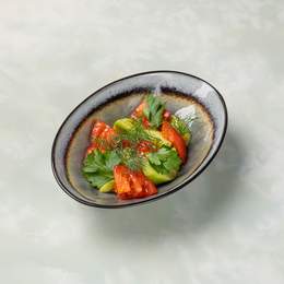 Помидор, огурцы, соус сырный, соус баклажан, кешью, кинза, баклажаны