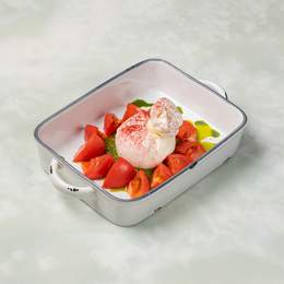 Сыр буррата, помидоры черри, песто, оливковое масло, зеленое масло, пудра свекольная