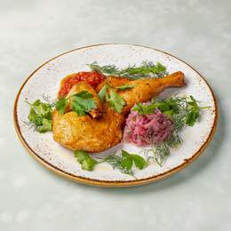 Цыпленок половина, маринованный лук, аджика — болгарский перец, лук, помидор, зелень