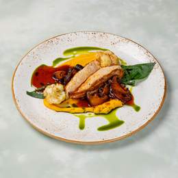 Куриное филе, морковное пюре, шпинат , цветная капуста, шпинат , соус демиглас , грибы шиитаки, зеленое масло