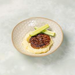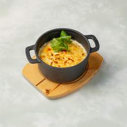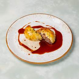 Говядина, бриошь, томленый лук, картофель , сливки, сыр страчетелоа, творожный сыр , сливочное масло , малосольный огурец