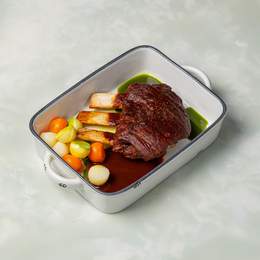 Ребро конины, соус демиглас, соус барбекю, картофель, морковь, кабачки, сливочное масло , зеленое масло