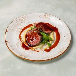 Филе конины, кенийская фасоль, айсберг, пюре из сельдерея, сироп, топинамбура , устричный соус